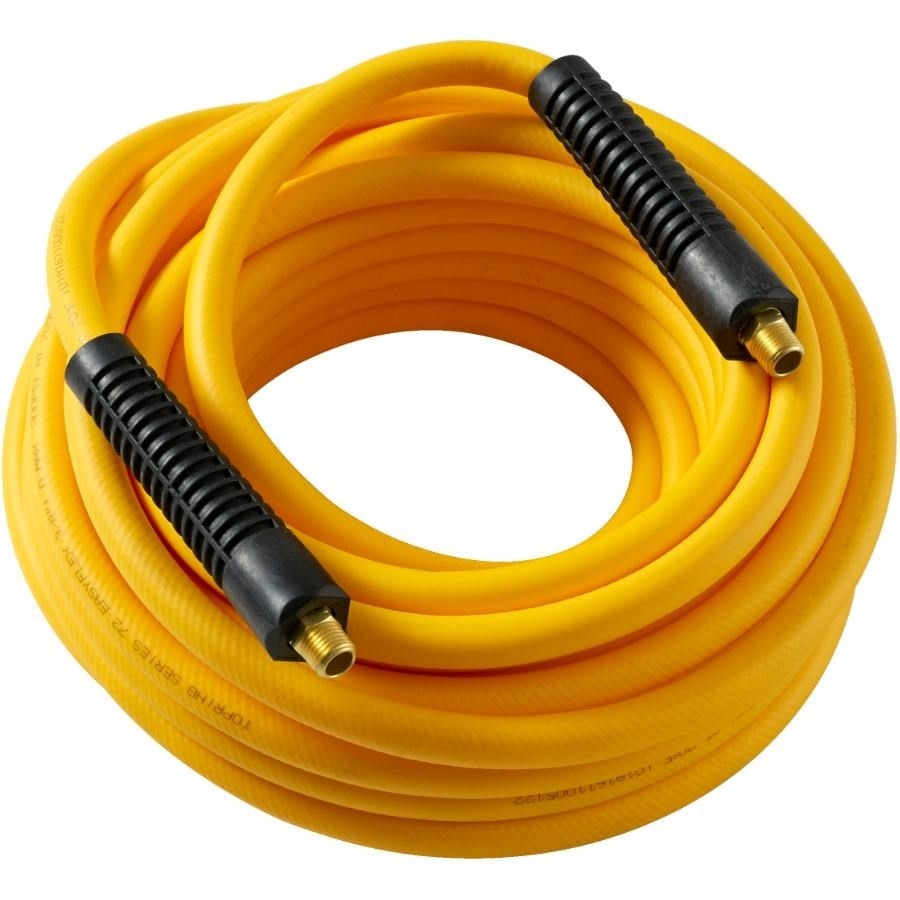 Ce tuyau à air Easyflex est 35 % plus léger que les tuyaux en caoutchouc. Caractéristiques : revêtement ne laissant aucune marque, avec des petits trous qui laissent s'échapper l'air pour empêcher le tuyau d'éclater ou de gonfler; excellente résistance à l'abrasion; conforme à la Classe B (RMA) qui désigne une résistance aux huiles moyenne/élevée ; aucune présence de silicone; conforme à la norme RoHs; gaine de protection de caoutchouc aux deux extrémités.