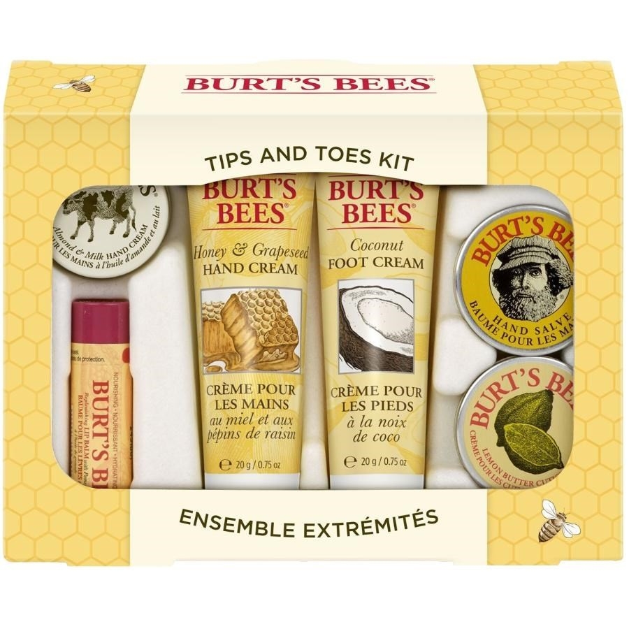 Assortiment de 6 échantillons de produits Burt's Bees pour les mains, les pieds et les lèvresCette trousse beauté procure une douceur et une hydratation remarquables à la peau sècheCes produits sont faits avec des ingrédients naturelsIdéal pour offrir en cadeauCOMPREND:7 g de crème pour les mains à la cire d'abeille et au lait d'amande4,25 g de baume pour les lèvres avec de l'huile de grenade20 g de crème pour les mains à l'huile de pépins de raisin et de miel20 g de crème pour les pieds à la noix de coco8,5 g de baume pour les mains8,5 g de crème pour les cuticules au beurre de citron