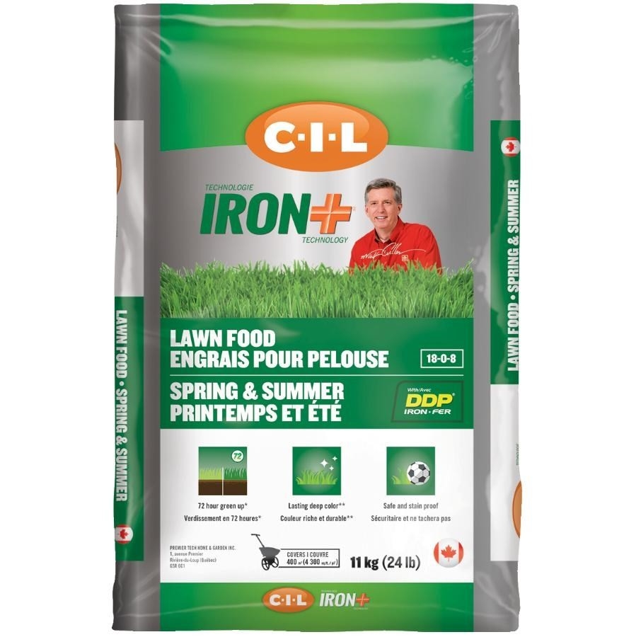 Votre pelouse verdira plus rapidement avec l'engrais pour pelouse C-I-L Iron +. Cet engrais C-I-L spécialement formulé rend votre pelouse visiblement plus verte en seulement 72 heures. Il contient 10 fois plus de fer afin de produire rapidement une forme de chlorophylle qui rend la pelouse plus verte, et 20 % d'azote à libération lente pour garder votre pelouse verte plus longtemps. Vous avez peur d'endommager votre patio ou votre terrasse? Mais non. Cet engrais pour pelouse a une formule qui ne tache pas afin de protéger les surfaces dures. La formule 18-0-8 de cet engrais C-I-L libère de façon constante et sur une longue durée des nutriments sur une superficie pouvant atteindre 4300 pieds carrés.