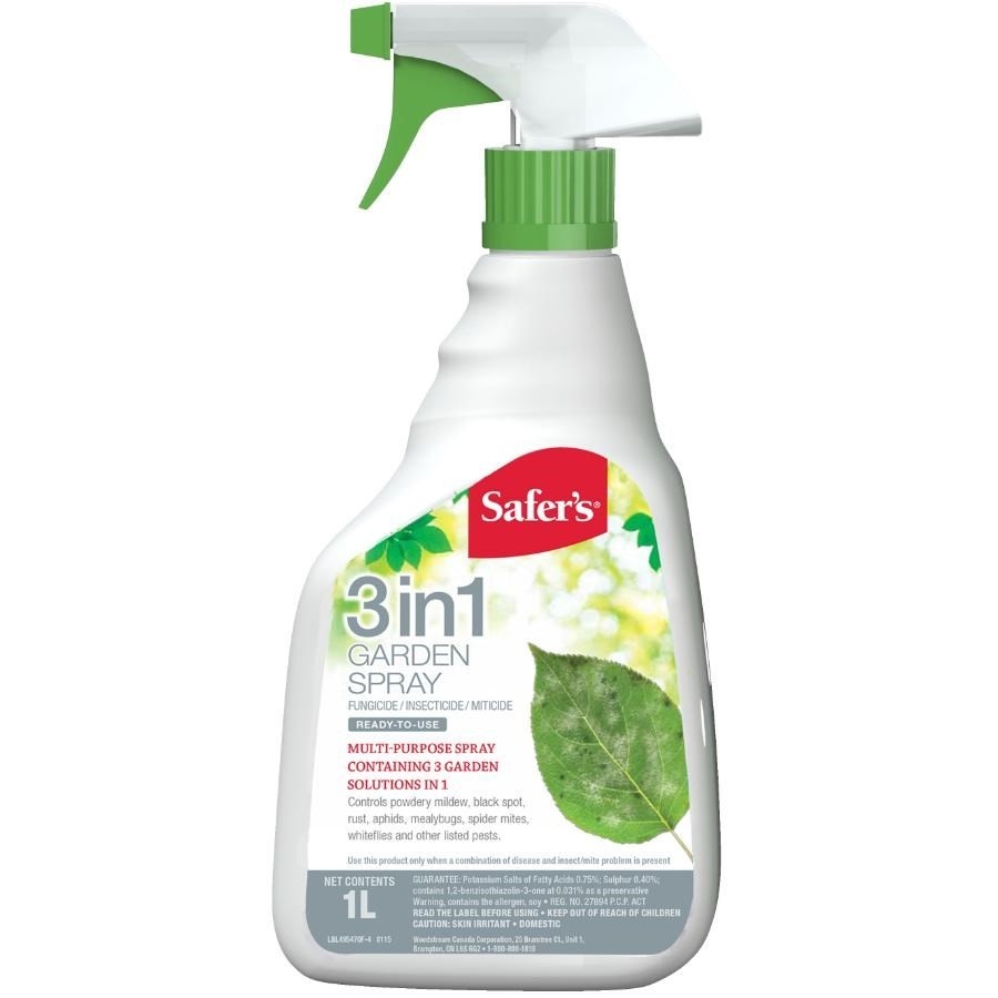 La solution à vaporiser 3-en-1 de Safer's pour le jardin est un aérosol multi-usage qui renferme 3 solutions en une bouteille pratique prête à l'emploi! Ce fongicide, insecticide et acaricide contrôle l'oïdium, la tavelure, la rouille, les pucerons, les cochenilles, les tétranyques, les aleurodes et de nombreux autres insectes énumérés. Ce produit combine l'efficacité du savon insecticide et celle de notre fongicide à base de soufre. La polyvalence de la solution à vaporiser 3-en-1 de Safer's facilite l'entretien du jardin.