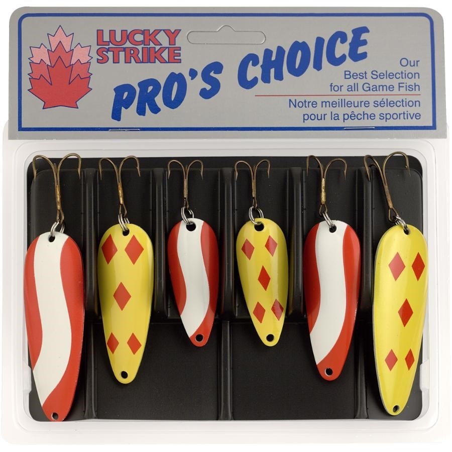 Fait en acier de moyenne épaisseurPlaqué nickelConçu pour une profondeur de 2 à 15 piCouleur: 3 leurres rouges et blanches et 3 leurres jaunes et rougesPaquet de 6COMPREND:2 leurres de 2 po2 leurres de 2-1/2 po2 leurres de 3 po