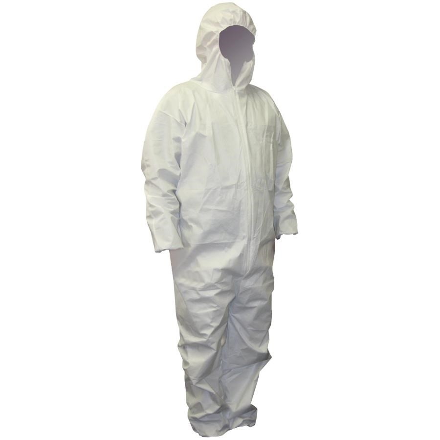 Fabriqué en polypropylèneLéger et respirantFermeture à glissière avant pour un ajustement facileCapuchon fixePoignets et chevilles élastiques pour ajustement plus serréTaille: très grand