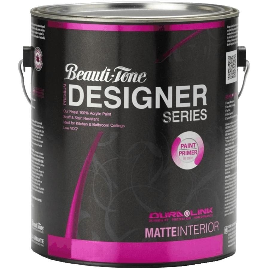 Si le moment est venu de peinturer, armez-vous de ce qui se fait de mieux. Offerte exclusivement chez Home Hardware, la peinture au fini mat de la gamme Designer de Beauti-Tone est une peinture exceptionnelle faite à 100 pour cent d'acrylique et formulée avec la plus récente technologie de peinture. Créée pour les bricoleurs amateurs, mais adorée des professionnels de la peinture, cette peinture avec apprêt de qualité exceptionnelle est la crème de la crème. Elle est idéale pour le salon, la salle à manger, la chambre, le corridor, la cuisine, le plafond de la salle de bain ou à n'importe quel endroit où un fini robuste longue durée est nécessaire.