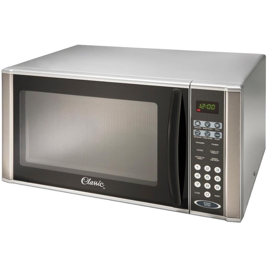 Cet élégant four à micro-ondes 1 000 watts au fini inox et argent offre 10 niveaux de puissance, une décongélation en vitesse et par poids pour la viande, la volaille et les fruits de mer, une cavité en acier peint, une poignée à tirer sur la porte et une table tournante en verre de 315 mm de diamètre.